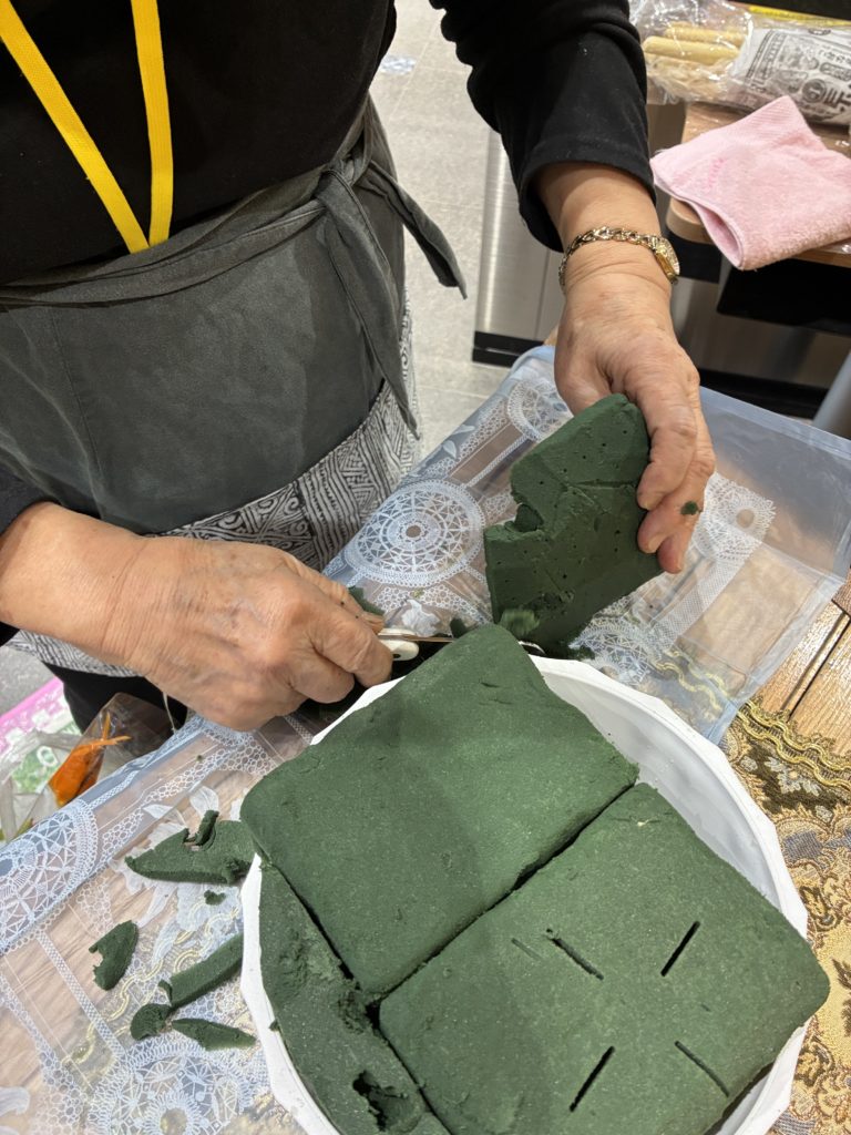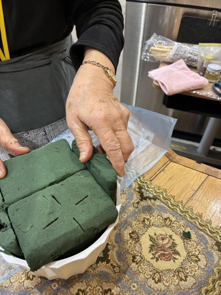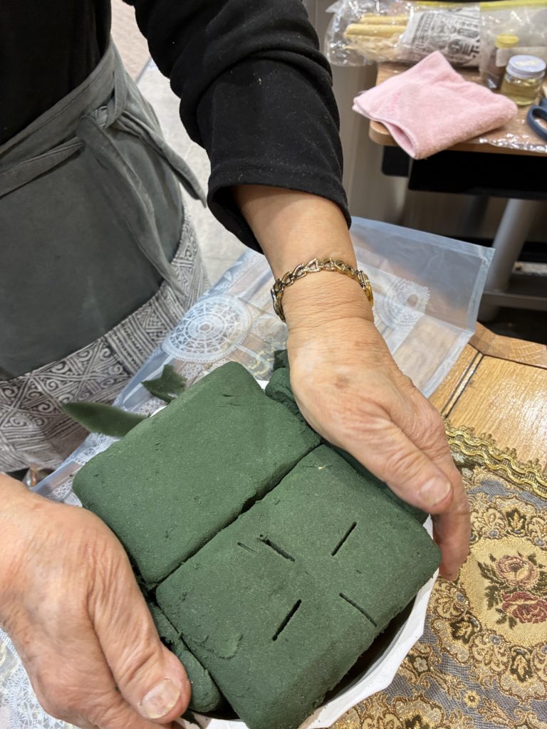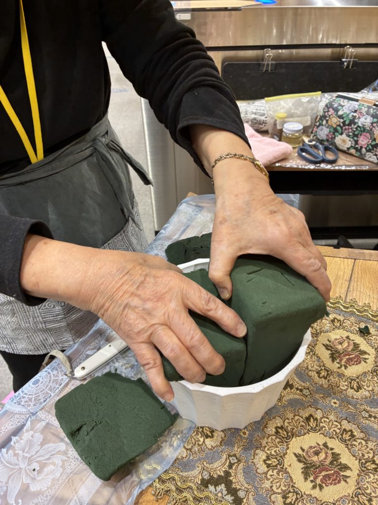 ②オアシス(緑のスポンジ)を、器の大きさに合わせて入れていきます