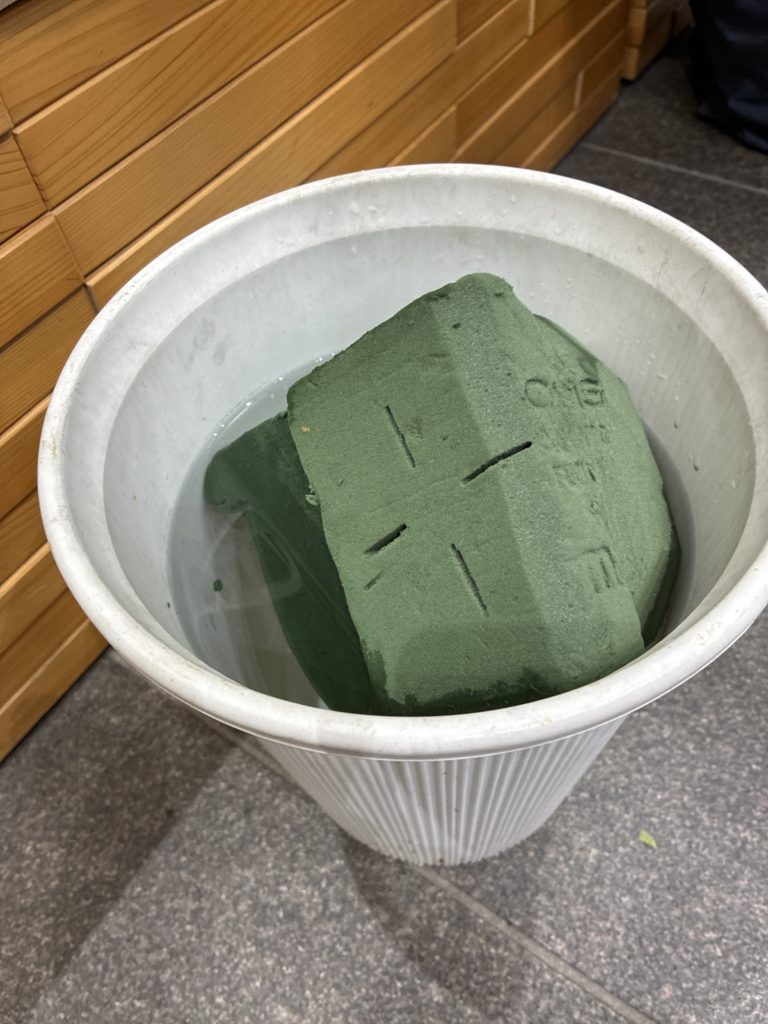 ①持参したバケツにお水を汲み、オアシスに水を吸わせます。